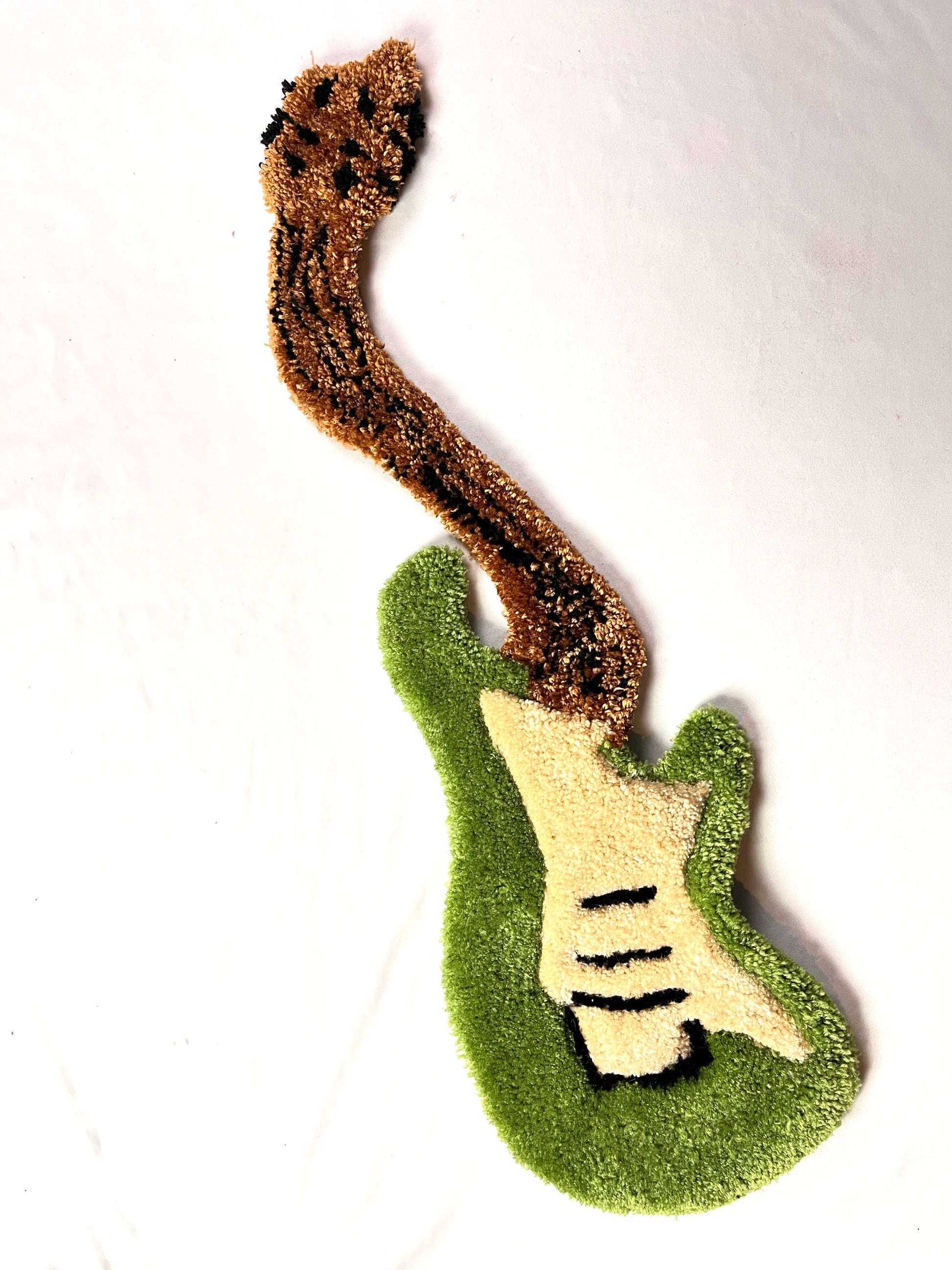 This rug features a playful green and white wave design with a classic guitar silhouette in the center. It's the perfect size to place above your guitar stand or to add some personality to the music room.